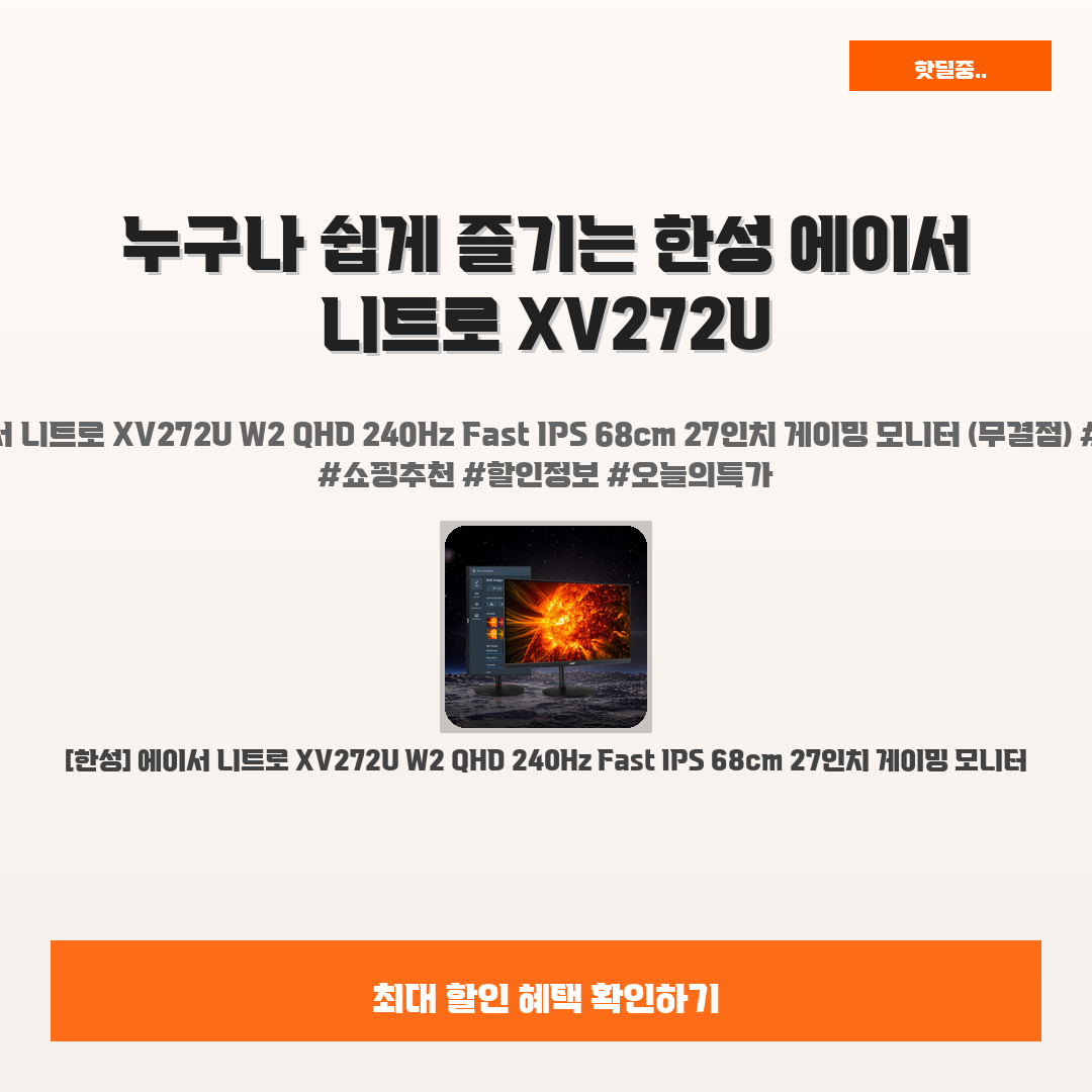 🛍️ 이 포스팅은 네이버 쇼핑 커넥트 활동의 일환으로,판매 발생 시 수수료를 제공받습니다.오늘 소개할 제품은 단연코,그것은 바로 한성 에이서 니트로 XV272U입니다!요즘 게이밍 모니터 찾고 계신가요? 성능과 가성비가 동시에 만족스러운 모니터는 정말 찾기 힘들죠. 하지만, 한성 에이서 니트로 XV272U는 그런 고민을 한 방에 해결해준답니다.이 모니터는 QHD 해상도와 240Hz의 빠른 주사율로 놀라운 게이밍 경험을 선사해주죠. 사용하면서 느낄 수 있는 그 몰입감은 진짜 다른 세계로 초대하는 것 같아요.심지어 할인가 379,000원의 매력까지! 더 이상 고민할 필요 없습니다. 이 가격에 이 성능! 한성 에이서 니트로 XV272U를 놓치지 마세요!※ 이거 진짜 제가 직접 써보고 쓰는 리뷰예요 광고 아님!..